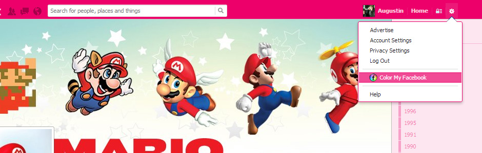 Go on Facebook (or reload it): now it’s pink! To change color, click on the top right white wheel and click ‘Color My Facebook’ item.